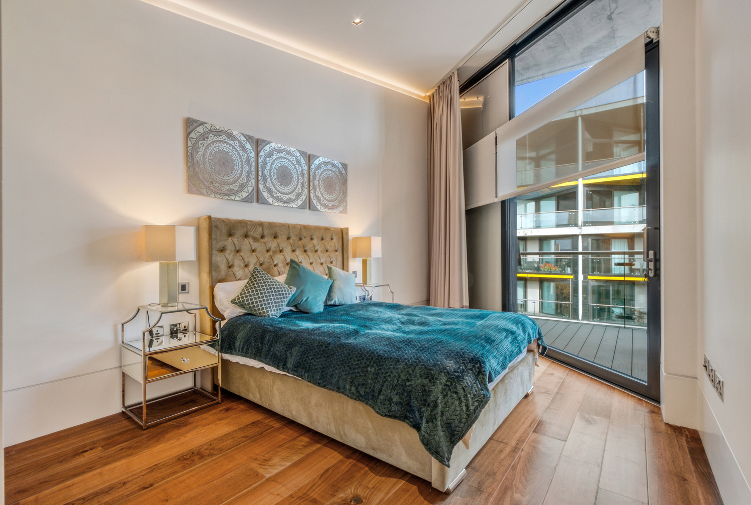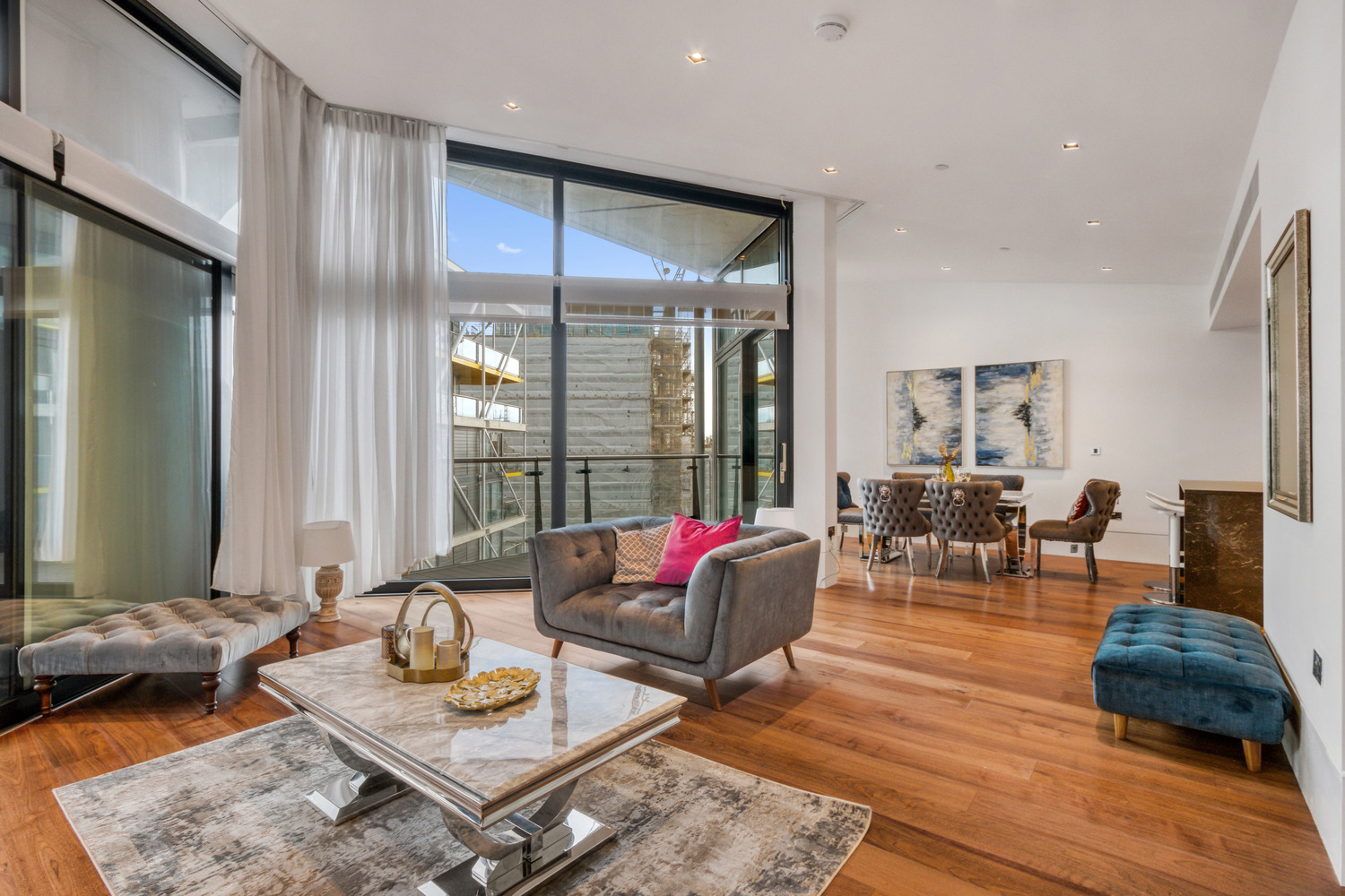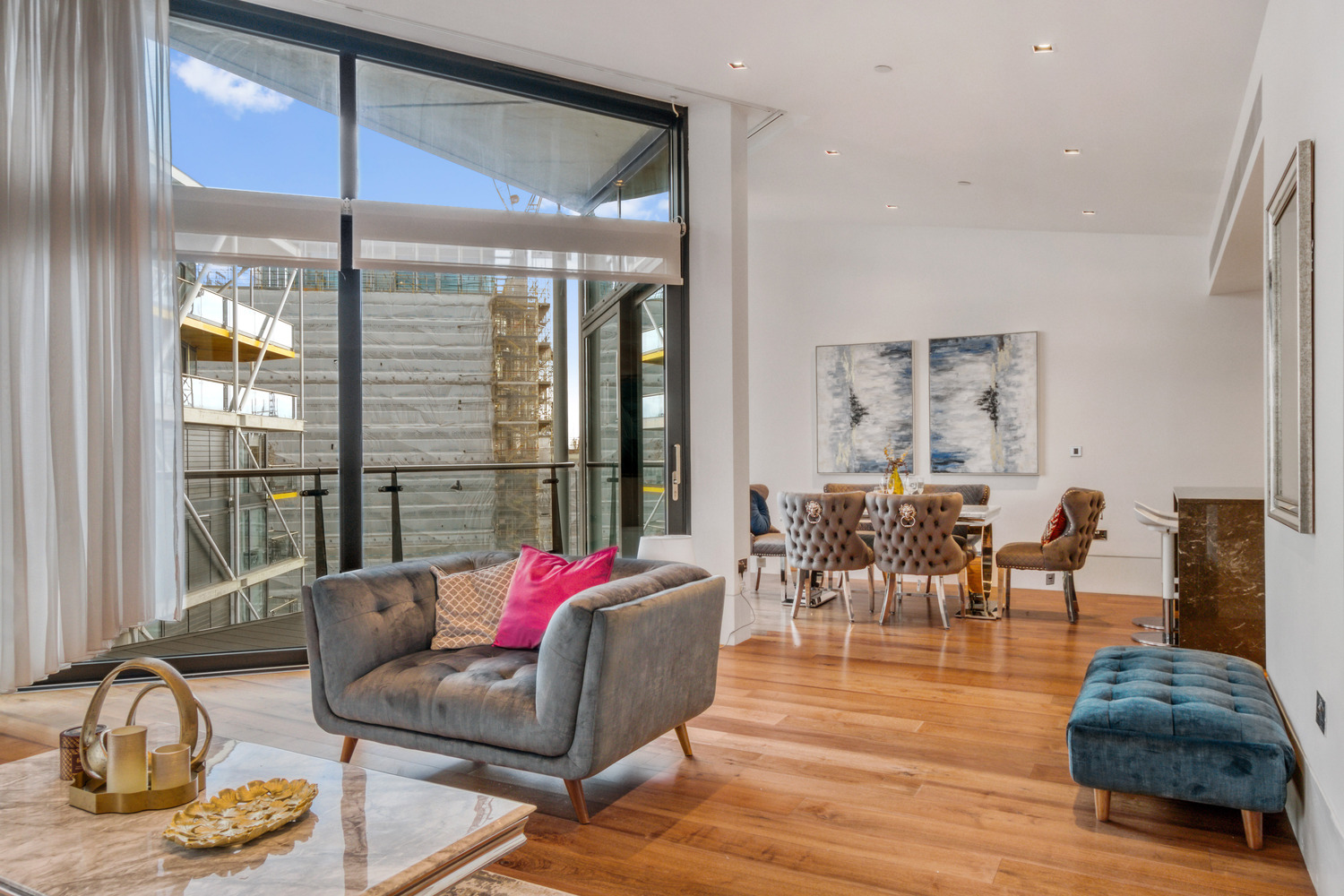 Three-bedroom apartment in the Riverligh Quay project that has recently been decorated. The oak flooring, three separate bathrooms, two en-suites, built-in storage in every bedroom, comfort conditioning, washing dryer, and a stylish integrated fully equipped kitchen are all features of this completely furnished apartment. Three separate balconies are another perk of this house.