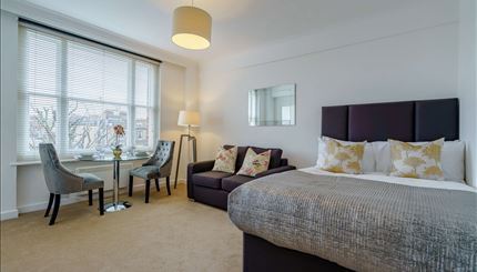 Explore refined living in this fifth-floor studio apartment, nestled in Mayfair's heart, adjacent to Berkeley Square. Boasting 266 sq ft, this red brick haven features a spacious living area, modern bathroom, and a distinctive kitchenette with garden access.