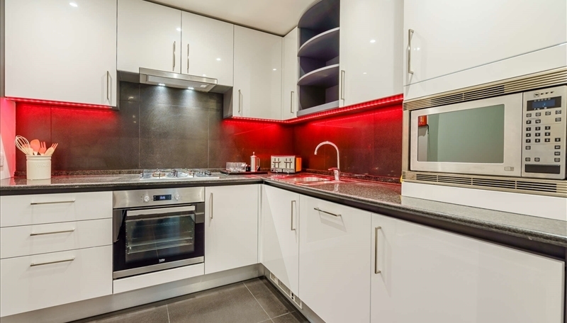 Fully equipped kitchen with LED lighting, full-sized appliances