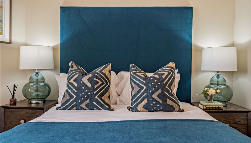 Spacious bedroom with a king-size bed, bespoke fitted mirrored wardrobes, and luxury furnishings