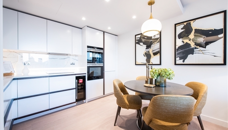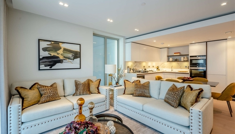 Indulge in the luxury of this meticulously designed two-bedroom, 4th-floor apartment covering 843 sq ft. The spacious open-plan reception room leads to a private balcony, and the fully integrated kitchen features Siemens and Miele appliances, including an oven, induction hobs, large fridge freezer, dishwasher, and wine chiller, all set into composite stone worktops. Enjoy comfort cooling throughout the entire apartment.