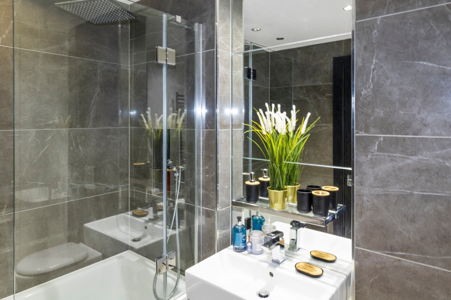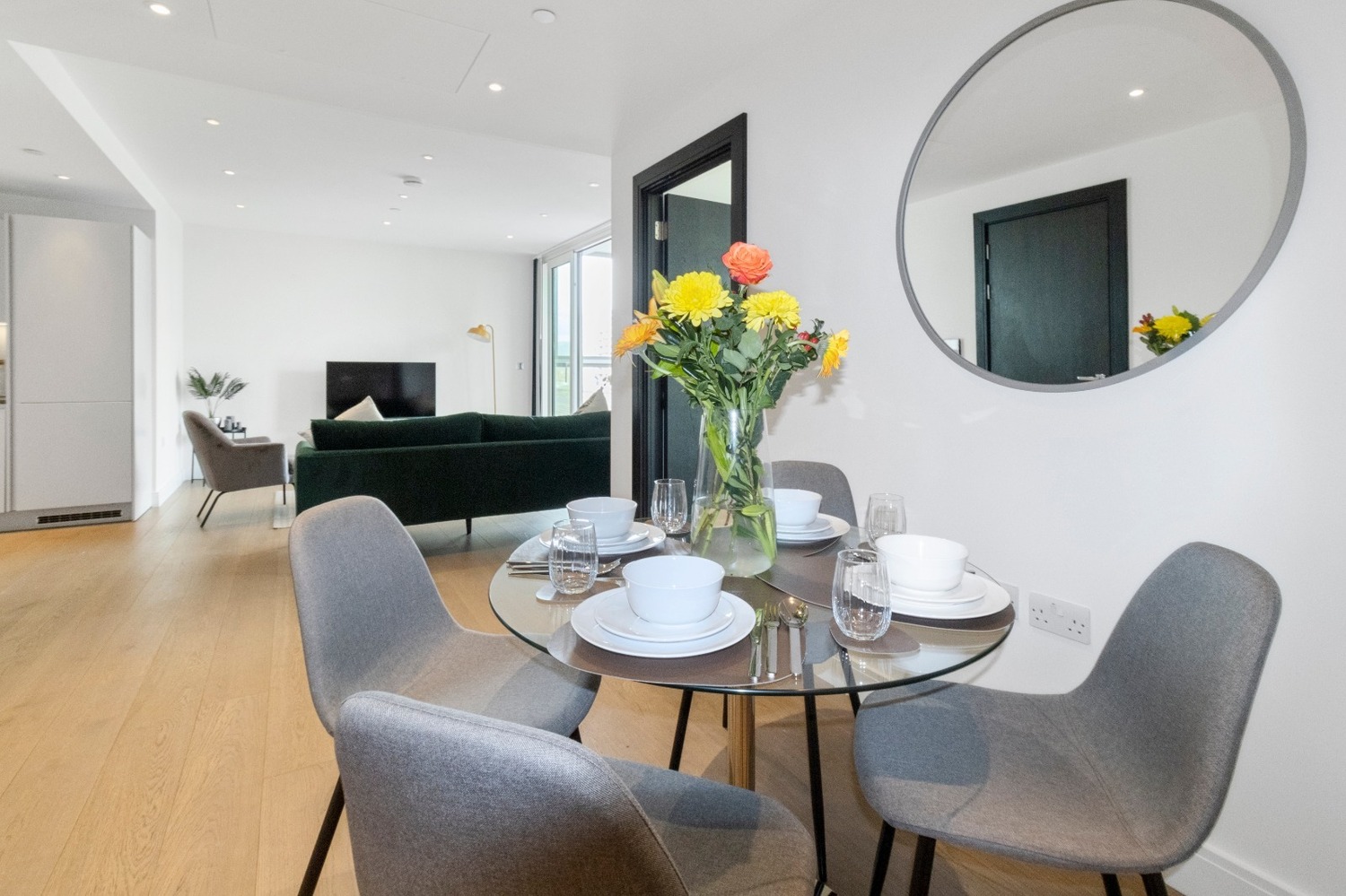 The apartment is completed with a luxurious finish, air conditioning, hardwood flooring and light carpets, an open plan living/kitchen, bright and large windows, a high specification kitchen with integrated appliances, and a lavish bathroom with marble walls and ambient lighting.